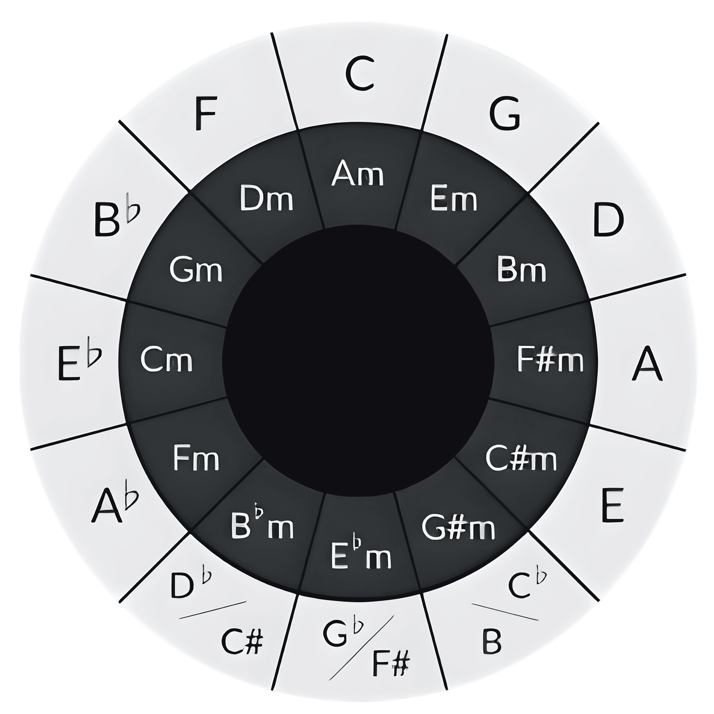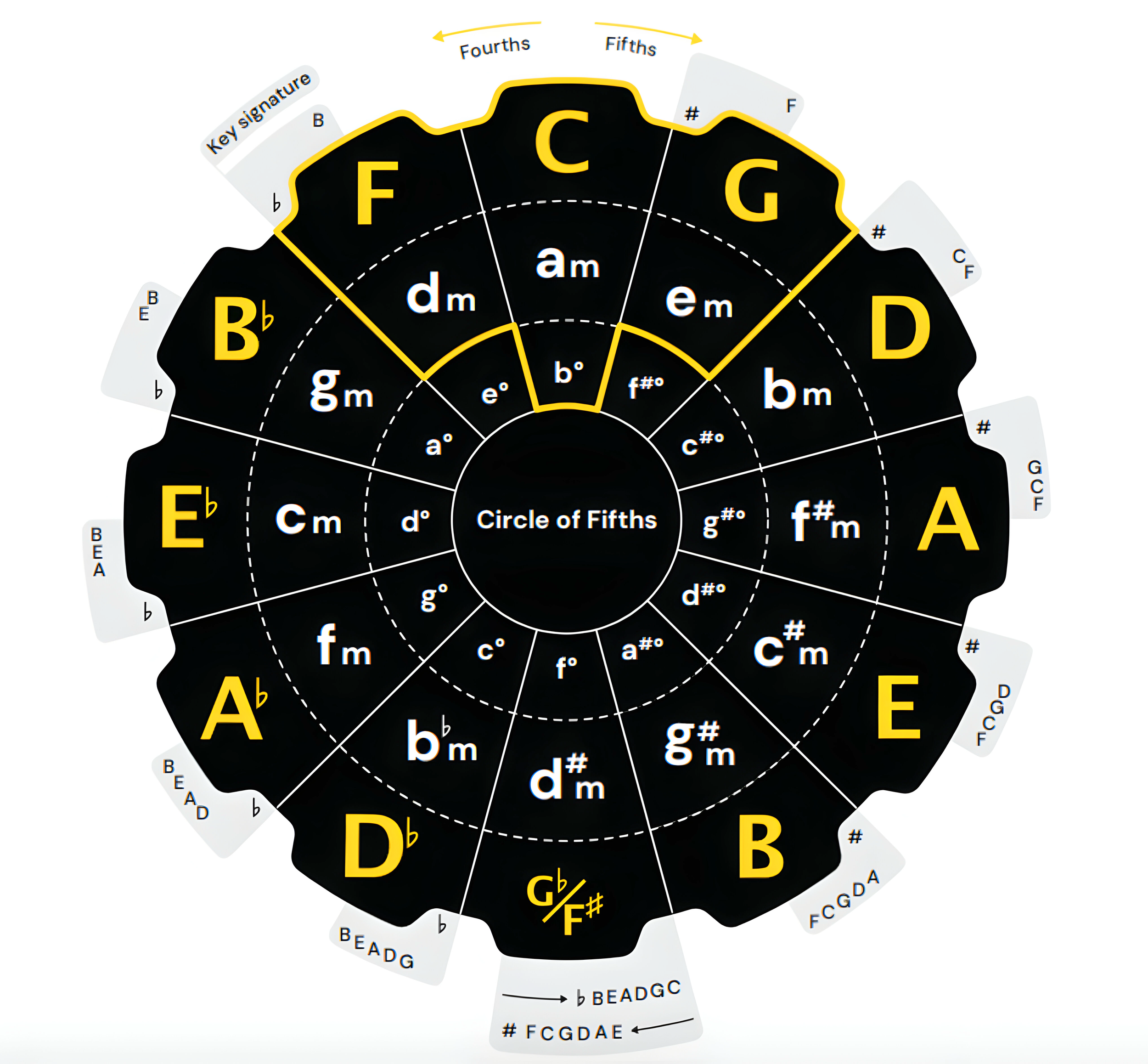 At the top of the circle is C, which has no sharps or flats. Each key on the circle also has a matching minor key that uses the same sharps or flats. Keys that are next to each other on the circle sound good together, which is why the circle is useful for finding chords and key changes. Overall, it’s a quick way to see which keys are closely connected and how music naturally moves from one key to another.